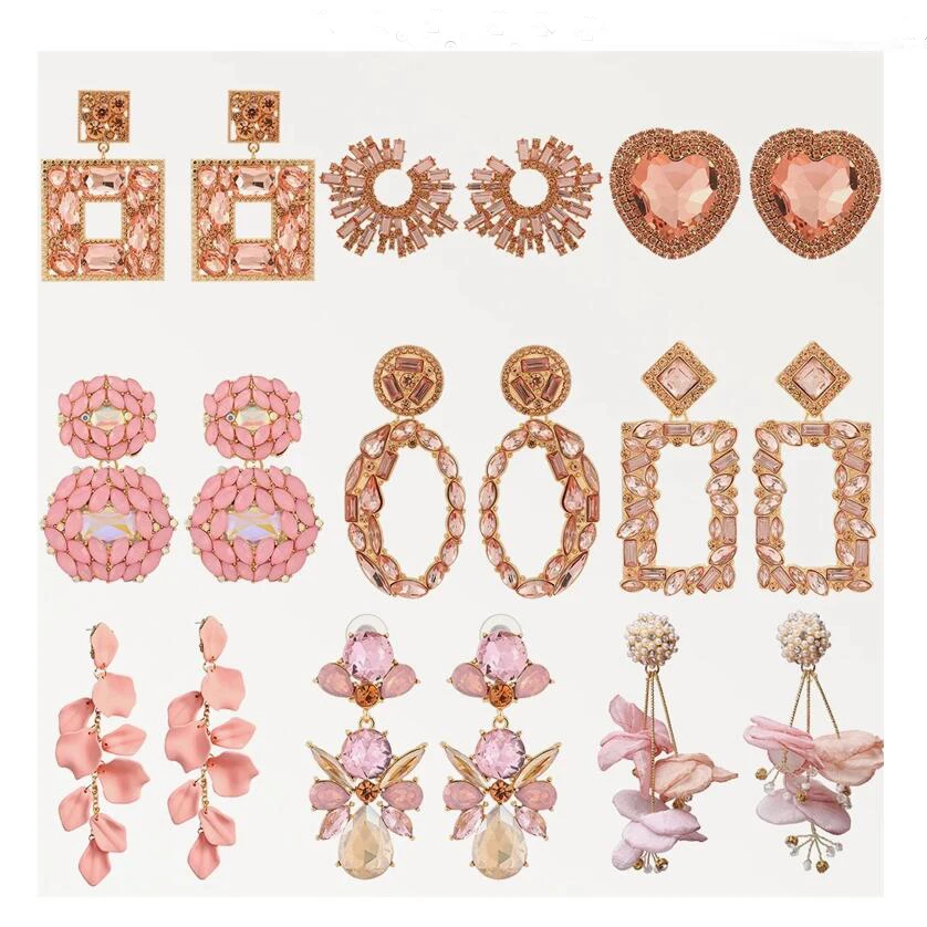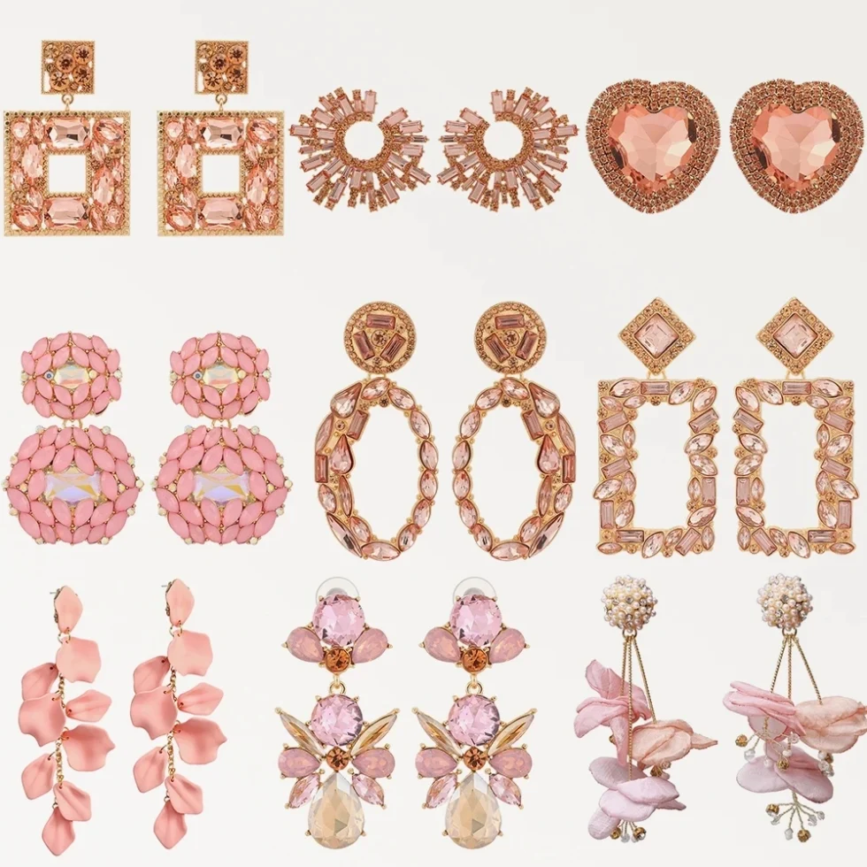 This stunning collection of pink crystal cotton dangle earrings features nine unique models, each adorned with colored gemstones and high-quality rhinestones. Crafted with attention to detail, the earrings offer a perfect blend of elegance and charm, making them an ideal accessory to complement any look. Available in various styles, each pair is designed to add a pop of color and sophistication to your jewelry collection.