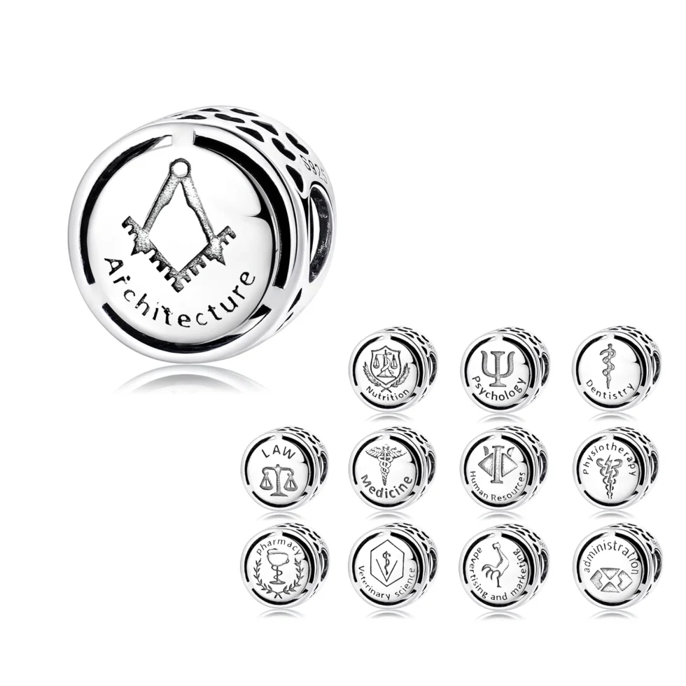 This collection of silver charm beads is designed to fit perfectly on your bracelets and bangles. Each bead represents a unique job or profession, with 12 different designs to choose from. Personalize your bracelet with a charm that reflects your career or passion, making it a meaningful accessory. Crafted with high-quality silver, these beads add a thoughtful and stylish touch to your jewelry collection. Perfect for showcasing your individuality or gifting someone special.